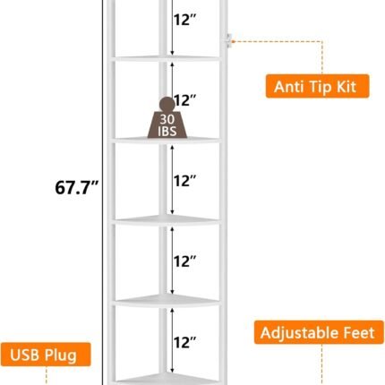 6 Tier Corner Shelf with Light, 67.5” Tall Standing Shelf Organizer, White Narrow Bookshelf with Storage Rack for Wall Corner, Living Room, Bedroom, Metal Frame, Wood Display Shelf