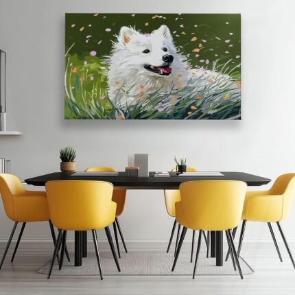 Frameless Canvas Decorative Painting Grass Petals Animal Dogs, Oil Painting Style Wall Decor Art Pictures for Bedroom Office Home Decoration Gifts, 55 x 28 Inches Unframed