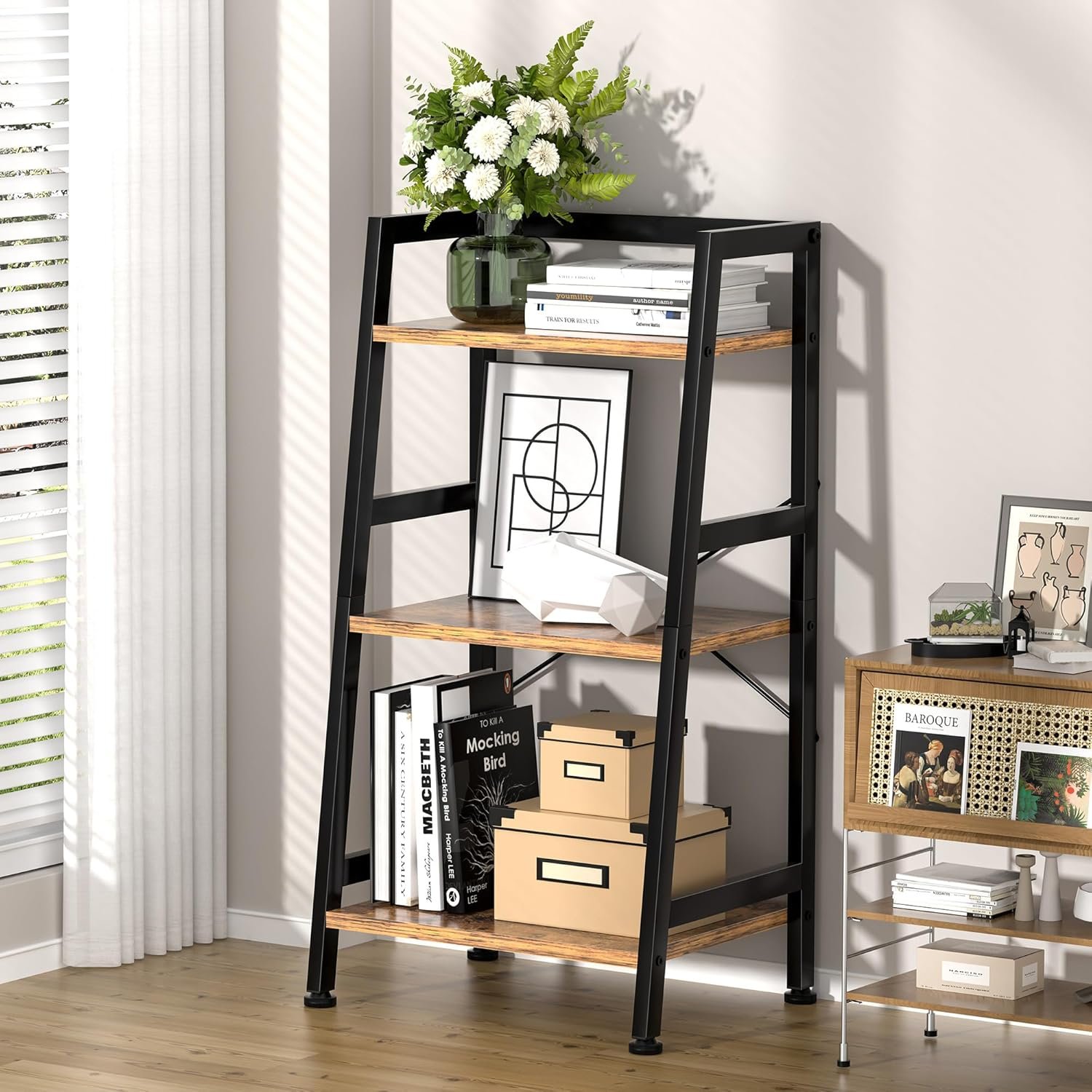 3-Tier Bookshelf, Ladder Shelf, Industrial Bookcase with Steel Frame, Metal Small Bookcase, Stand up Shelves for Living Room, Home Office, Kitchen, Bedroom, Industrial Style(Rustic Brown & Black)