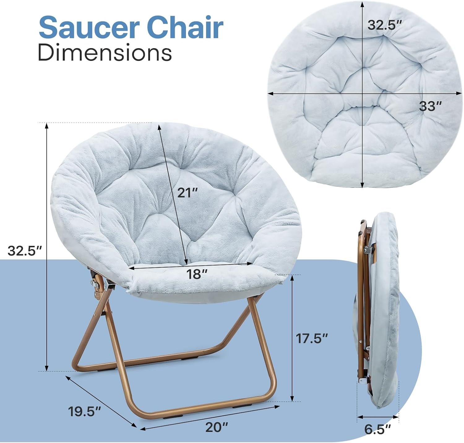 Foldable Oversized Moon Chair, Large Soft Lazy Cozy Comfortable Faux Fur Round Saucer Moon Chair for Teens and Adults, Light Blue