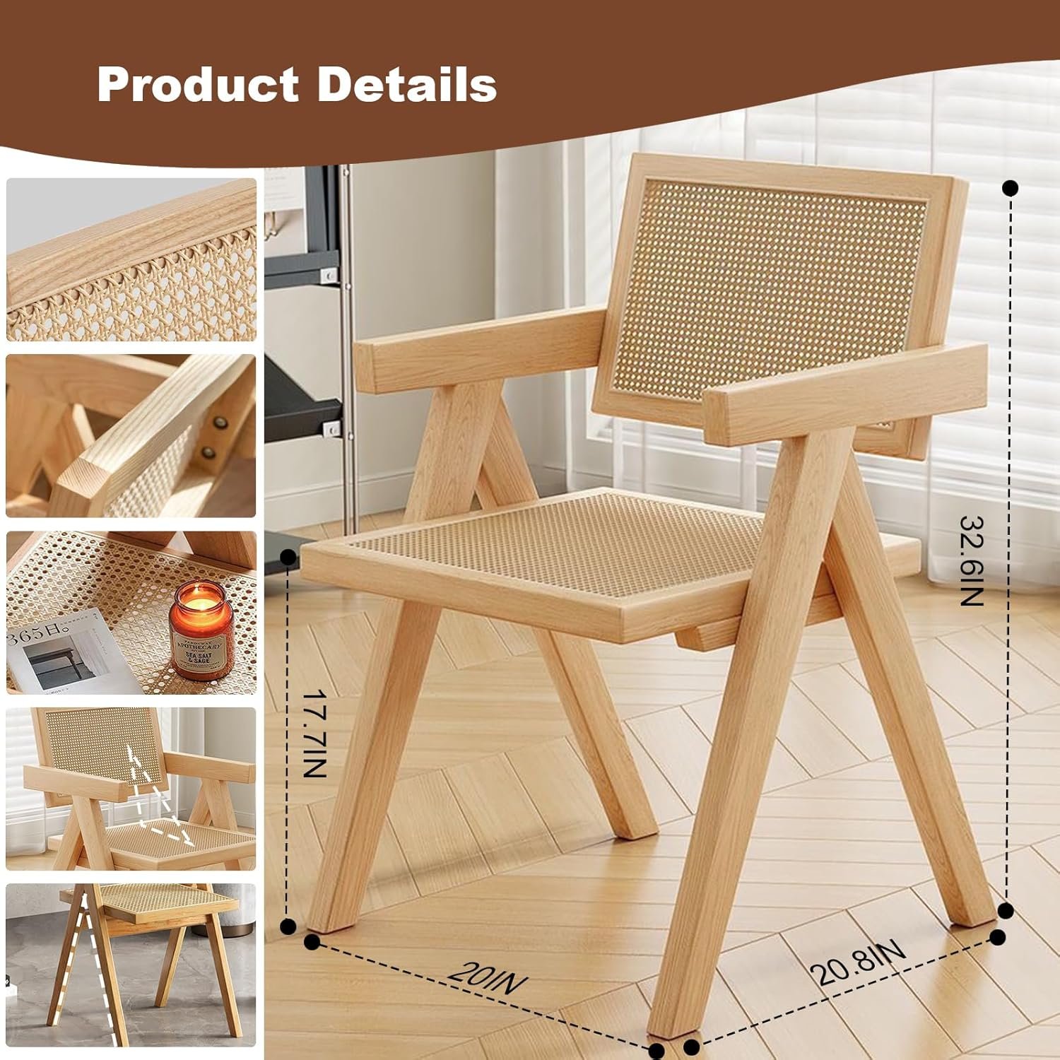 Rattan Dining Chair, Wood Kitchen Cane Comfy Arm with Woven Backrest and Seat, for Living Room Bedroom Kitchen Reataurant Dining Chairs (Original Wood Color)