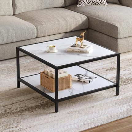 White Coffee Table with Storage 2 Tier Modern Suqare Coffee Tables for Living Room Small Faux Marble Center Table for Office Apartment Home, Easy Assembly